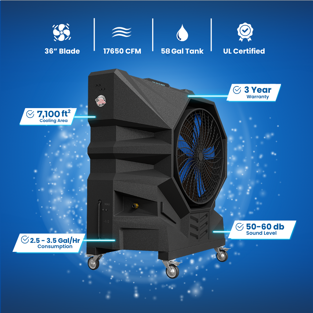 Best CFM to price ratio I found for cooling fans I needed at my warehouse so decided to go with 2 units of the Polar-Jet 36! Delivery was fast and easy to assemble. All we had to do was put the castors at the bottom, plug into a 110V outlet, fill up water and we were all set. The Jet-36 is a MONSTER. Cooled down my space within 30 minutes and surprisingly very quiet. Highly recommend going with Polar Blades in terms of overall build and quality of product. The service is good as well but it did take some time to ship and I needed these fans ASAP since it was getting hot. Happy with the investment!